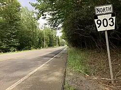 Pennsylvania Route 903 (PA 903) is a 17.7-mile-long (28.5 km) state highway located in Carbon and Monroe counties in Pennsylvania. The southern terminus is at U.S. Route 209 (US 209) in Jim Thorpe. The northern terminus is at PA 115 in Tunkhannock Township. The route runs through rural areas of the Pocono Mountains, with an interchange with the Pennsylvania Turnpike Northeast Extension (Interstate 476, I-476) in Penn Forest Township and a junction with PA 534 in Kidder Township. PA 903 is a two-lane undivided road nearly its entire length, besides the I-476 intersection. The route was designated in 1928 between US 209/US 309 in present-day Jim Thorpe, and a connecting road, now PA 115, south of Blakeslee. The highway was fully paved in the 1930s. Between 2008 and 2015, an E-ZPass-only interchange was constructed with I-476.