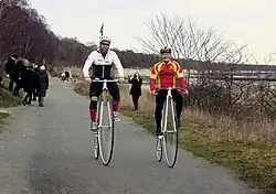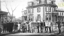The bike, with the one wheel dominating, led to riders being referred to in America as "wheelmen", a name that lived on for nearly a century in the League of American Wheelmen until renamed the League of American Bicyclists in 1994.[45] Clubs of racing cyclists wore uniforms of peaked caps, tight jackets and knee-length breeches, with leather shoes, the caps and jackets displaying the club's colors. In 1967 collectors and restorers of penny-farthings (and other early bicycles) founded the Wheelmen,[46] a non-profit organization "dedicated to keeping alive the heritage of American cycling".