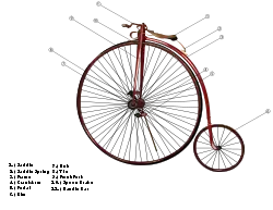 The penny-farthing, also known as a high wheel, high wheeler or ordinary, is an early type of bicycle.[1] It was popular in the 1870s and 1880s, with its large front wheel providing high speeds, owing to its travelling a long distance for every rotation of the wheel. These bicycles had solid rubber tires and as a consequence the only shock absorption was in the saddle.