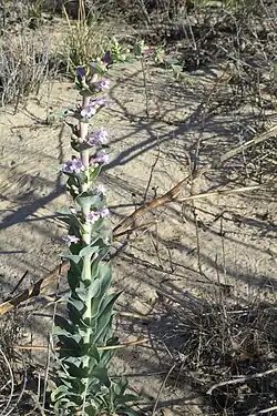 Penstemon buckleyi is a herbaceous plant with stems that grow straight upwards or outwards a short distance before growing upwards reaching as much as 82 centimeters (32 in), but more commonly 15 to 55 cm (6 to 22 in).[3] They are stoutly built and grow from branched caudex or large crown topping a taproot.[4] Each plant will have one to five stems that are hairless and glaucous, covered in a waxy bloom, as are its leaves.[4]