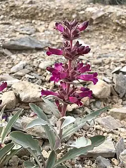 Penstemon monoensis is a species of penstemon known by the common name Mono penstemon. It is endemic to the White and Inyo Mountains of eastern California, where it grows in scrub, woodland, and sandy washes. It is a perennial herb growing erect to about 30 centimeters tall, gray-green in color from a dense coating of light hairs. The paired leaves are lance-shaped, sometimes toothed or wavy along the edges and up to 12 centimeters long. The glandular inflorescence bears cylindrical or funnel-shaped flowers in shades of bright to deep pink, measuring around 2 centimeters in length. The mouth of the flower may have a white or pale area on the floor with a patch of hairs, and the staminode is usually hairy.