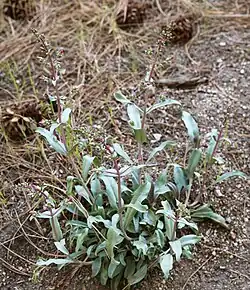 Penstemon patens is a species of penstemon known by the common name Lone Pine beardtongue. It is native to the central Sierra Nevada of California and slopes and plateau to the east, its distribution extending just into Nevada. It grows in forest, woodland, and scrub habitat types. It is a perennial herb producing hairless, waxy stems up to about 40 centimeters tall. The thick, lance-shaped, gray-green, opposite leaves are up to 9 centimeters long and 2 wide. There are usually many leaves clustered around the base of the plant and smaller pairs higher on the stem. The inflorescence bears wide-mouthed tubular flowers up to 2 centimeters long with corollas in shades of lavender to magenta. The flower is mostly hairless except for the staminode which may have a coat of orange or yellowish hairs.