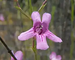 Penstemon thurberi is a species of penstemon known by the common names Thurber's beardtongue and Thurber's penstemon. It is native to the southwestern United States and northern Mexico, where it grows in many types of desert and mountain habitat, including sandy flats, chaparral, scrub, and woodlands. It is a shrub growing erect and somewhat rounded in form, reaching around 80 centimeters in maximum height. Many slender stems emerge from its woody base. The leaves are narrow, linear in shape, with edges rolled upward nearly into a tube. The long inflorescence bears funnel-shaped lavender, pink, or pale blue-purple flowers up to 1.5 centimeters in length.