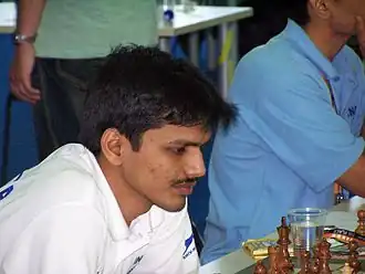 His progress was such that, at the age of 14 years 5 months, he joined the Indian team for the 2000 Chess Olympiad, scoring 6.5 out of 11 rounds and earning his first Grandmaster norm. The second and third norms came soon after with a solid 6.5/13 result placing fifth in Corus Group B and sharing seventh place at the Asian Individual Championship with 7/11.[5][6] This last norm both qualified him for the FIDE World Chess Championship 2002 (knocked in the first round to Alexander Beliavsky) and secured his Grandmaster title, having reached the required FIDE rating of 2500 in the July 2000 rating list.[7]