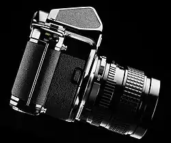 The Pentax 6×7 (called "Pentax 67" after 1990) is a SLR medium format system film camera for 120 and 220 film, which produces images on the film that are nominally 6 cm by 7 cm in size (actual image on the film is 56 mm × 70 mm), made by Pentax. It originally debuted in 1965 as a prototype dubbed the Pentax 220. Since then, with improvements, it was released in 1969 as the Asahi Pentax 6×7, as well as the Honeywell Pentax 6×7 for the United States import market. In 1990, it received a number of minor engineering updates and cosmetic changes and was renamed as the Pentax 67.