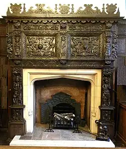 The Dodderidge family took its name from a manor in the parish of Sandford, near Crediton. Richard Dodderidge was the son of a wool merchant and was born in South Molton, in which town he married. With his wife and eight children before 1582 he moved to Holland Street, Barnstaple and served as Mayor of Barnstaple in 1589.[2] A certain John Dodderidge, perhaps a relation, is recorded earlier in 1579 as mayor of Barnstaple.[3] In 1585 Richard bought a house in Cross Street from his fellow burgess Thomas Skinner, which descended in turn to his sons Sir John and to the latter's brother Pentecost Dodderidge (d. circa 1650.[4] This large timber-framed house, known as the "Dodderidge House" was demolished in about 1900 to make way for a post office, the present large sandstone building with the date "1901" sculpted on its parapet. A room of ornate carved oak panelling dated 1617 from this house survives in Barnstaple Guildhall, known as the "Dodderidge Room" and an ornate overmantel displays the date 1617 between the initials "PD" and "ED", signifying Pentecost and his wife Elizabeth.[5] The room is now used to display the Corporation's silver and the mayor's regalia.