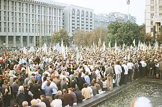The People's Movement of Ukraine (Ukrainian: Народний Рух України, romanized: Narodnyi Rukh Ukrayiny) is a Ukrainian political party and one of the first opposition parties in Soviet Ukraine.[14] It is often simply referred to as the Movement (Ukrainian: Рух, romanized: Rukh). The party under the name Rukh was an observer member of the European People's Party (EPP) until 2013. It is considered to have played a key role in Ukraine regaining its independence in 1991.[15][16][17]