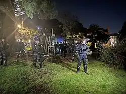 Just after midnight on August 3, 2022, the UC Berkeley Police Department and contractors began fencing off People's Park. Protesters gathered after multiple "bulldozer" alerts were shared when workers began unloading heavy machinery and construction equipment into the park. At about 3 a.m., activists tried to block the movement of machinery into the park by lying on the road, and arrests were made.[11] By noon, 47 trees in People's Park were cut down by a local company.[77][78]