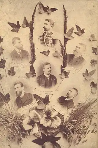 An original "People's Party" had been formed in Rumelia by Geshov and Konstantin Velichkov, earning immediate support from intellectuals such as Bobchen and Ivan Vazov. With a platform of Bulgarian nationalism and Russophilia, it fought for national reunification,[5] which was eventually obtained, with support from the Russian Empire, in September 1885. This original faction of Populists maintained a say in the political affairs of the principality through family connections: the post-Conservative political clique formed at Ruse included Teodor Teodorov, who was Bobchev's father-in-law and also related by marriage to the Gubidelnikov family of businessmen.[6] A particularity of the Rumelian Populists' doctrines, in addition to qualified Russophilia, was their strong support for friendship with the neighboring Kingdom of Romania. In 1911, Adevărul of Bucharest reported that Geshov "has been violent in his rejection of all anti-Romanian provocations".[7]