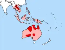 Fossil evidence suggests that dingoes arrived in Australia around 4,000 to 5,000 years ago, and spread to all parts of the Australian continent and its islands, with the exception of Tasmania.[30] These dates coincide with those of the arrival of Austronesian navigators in the Indonesia-New Guinea area. But while Dingo demonstrates probable contacts, these had no known demographic, cultural or linguistic influence.