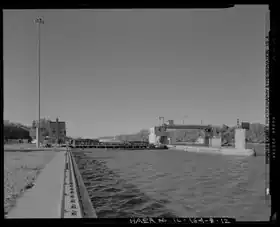 The Peoria Lock and Dam is a historic lock and dam complex on the Illinois River at Creve Coeur, Illinois. The complex was built in 1938-39 as part of an effort to make the river navigable and establish a route for barges between Chicago and the Mississippi River.[2][3] The U.S. Army Corps of Engineers designed the complex; their influence is particularly evident in the dam's control station, as the State of Illinois designed most other dam control stations along the river. The lock has a standard 100-by-600-foot (30 m × 183 m) chamber, similar to other locks on the river, and a vertical lift of 11 feet (3.4 m). The dam is 536 feet (163 m) long and includes 108 wicket gates and a Tainter gate; it is one of two Illinois dams that still use wicket gates.[4] The control station is for the most part a large, functional building, though it has Art Deco surrounds at the main entrance. The district also contains an original maneuver boat designed to raise and lower the dam's wicket gates; the boat is still used and is one of four boats of its kind left in the United States.[5]