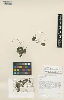 Plants that were epilithic had flattened leaves and spikes against the rock. Short, thick, subcormose stems measuring 0.2–0.8 x 0.15-0.25 centimetres. In the basal rosette, leaves appear to alternate. Petioles are 0.3-1.9 centimetres long and spreading-hirsute, with uniseriate hairs. The blade of a leaf are 0.5-1.8 x 0.5-1.8 centimetres; broadly ovate to suborbicular or subreniform; impeltate or hardly rounded to subtruncate; broadly rounded to moderately acute apically; palmate: 3-5 nerved; appressed-hirsute on both sides (more sparsely so above); pellucid-gland dotted at least above. single, basal inflorescences. Peduncles are purbes as petioles, measuring 1.3–4.1 centimetres. The An unbranched, indeterminate inflorescence: beakless, elliptical to wikt:subglobose, constricted to substipitate base, 2.7–7 centimetres x 0.3–0.4 millimetres; stigma apical.[4]