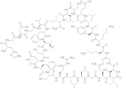 Peptide PHI, also known as peptide histidine isoleucine, is a peptide which functions as a hormone. This peptide contains a composition of 27 amino acids with histidine on the N-terminus and isoleucine on the C-terminus. It was originally isolated from the mammalian small intestine amongst mammalian neurons called intramural neurons which function in the motor activity of the intestinal walls.[1] An example of this was revealed in a study that demonstrated that this peptide regulates water and electrolyte transportation in the human jejunum; similar to its inhibitory effects on fluid absorption in the small intestine of pigs and rats.[2]