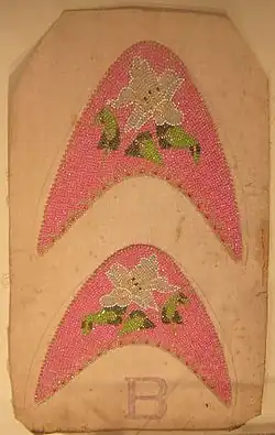 To sew the pattern, a laced-up wooden frame (pidangan)[4] is used to provide the right tension for the beading. The beading process starts from the center of the pattern, moving to the right then left. The main motif of the pattern is first beaded, followed by the background and then the border. The border may have a smooth or scallop-edge. When the beaded pattern is completed, it would be sent to the cobbler to be made into slippers. Leather is usually the preferred material for the beaded slippers, and may be either made with low or high heels.