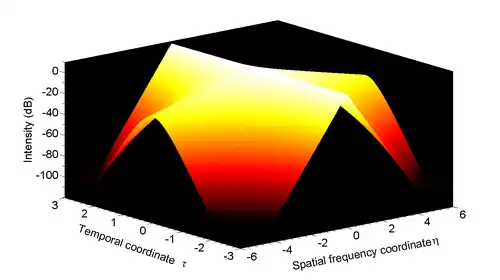 It is also possible to mathematically express the Peregrine soliton according to the spatial frequency :[3]