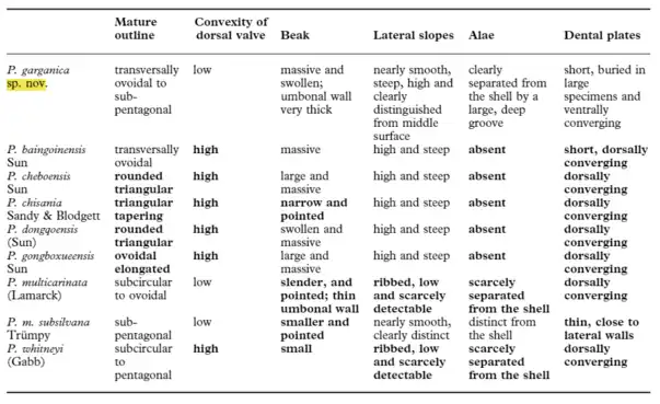 - ^ Posenato, Renato; Morsilli, Michele (October 1999). "New species of Peregrinella(Brachiopoda) from the Lower Cretaceous of the Gargano Promontory (southern Italy)". Cretaceous Research. 20 (5): 641–654. doi:10.1006/cres.1999.0171.