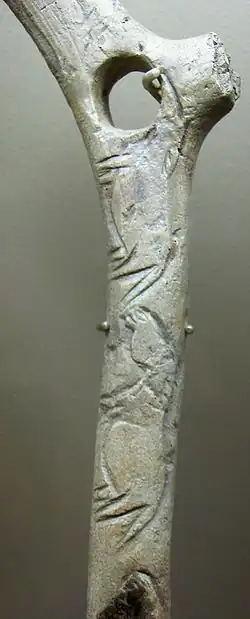 Bâtons percés are made from a length of antler, or ivory, with at least one round hole typically made at one end.[2] They often have abstract or animal designs etched into them (such as horses). They have been found at Aurignacian and Magdalenian sites of the Upper Paleolithic in Europe,[1] with examples dating from 35–12,000 years ago.[3] They have a joint at one end, often forming a T or Y shape, but always with a swelling of the antler at that end. There is a circular hole drilled through the antler just below the swelling or joint, and often a smaller second hole nearby on the shaft. Typical examples range from 6 to 8 inches (15 to 20 cm) in length.[4] One unusual bone baton from le Souci, Lalinde has a row of eight holes of different sizes.[5]
