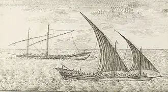 The original periaguas or piraguas were the dugout canoes encountered by the Spanish in the Caribbean. Small craft of greater capacity were created by splitting a dugout and inserting a plank bottom, while the freeboard was increased for sea voyages by adding planks on the sides. By the 18th century the term periagua was being applied to flat-bottomed boats, which could be 30 feet (10 m) or more long and carry up to 30 men, with one or two masts, which could also be rowed. Later in the 18th century periagua became the name for a specific type of sailing rig, with gaff rigged sails on two masts that could be easily struck, commonly with the foremast raked forward and the main mast raked back. The "periagua rig" was used on U. S. Navy gunboats on the Chesapeake Bay in the early 19th century. The term periagua was also applied to rowing scows similar to a john boat.[3]