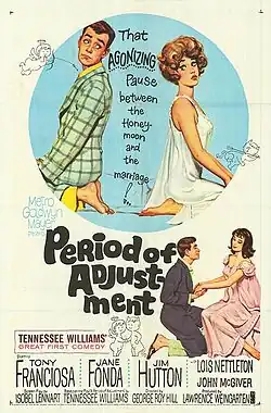Period of Adjustment is a 1962 American comedy-drama film directed by George Roy Hill from a screenplay written by Isobel Lennart, based on Tennessee Williams' 1960 play of the same name. The film stars Tony Franciosa, Jane Fonda, Jim Hutton and Lois Nettleton.