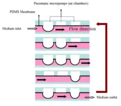 In microfluidics, it is often desirable to minimize the circulating volume of fluid. Traditional pumps require a large volume of liquid external to the microfluidic circuit. This can lead to problems due to dilution of analytes and already dilute biological signalling molecules.[9] For this reason, among others, it is desirable to integrate a micro-pumping structure into the microfluidic circuit. Wu et al. presented in 2008 a pneumatically actuated peristaltic micropump which eliminates the need for large external circulating fluid volumes.[8]