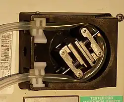 A peristaltic pump, also commonly known as a roller pump, is a type of positive displacement pump used for pumping a variety of fluids. The fluid is contained in a flexible tube fitted inside a circular pump casing. Most peristaltic pumps work through rotary motion, though linear peristaltic pumps have also been made. The rotor has a number of "wipers" or "rollers" attached to its external circumference, which compress the flexible tube as they rotate by. The part of the tube under compression is closed, forcing the fluid to move through the tube. Additionally, as the tube opens to its natural state after the rollers pass, more fluid is drawn into the tube. This process is called peristalsis and is used in many biological systems such as the gastrointestinal tract. Typically, there will be two or more rollers compressing the tube, trapping a body of fluid between them. The body of fluid is transported through the tube, toward the pump outlet. Peristaltic pumps may run continuously, or they may be indexed through partial revolutions to deliver smaller amounts of fluid.