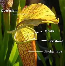 In pitcher plants, the peristome is a reflexed ring (or partial ring) of tissue that surrounds the entrance to the digestive tube in these plants. It often (for example in Cephalotus and Nepenthes) possesses sharp, overhanging 'teeth' which aid in prey retention. It is often studded with nectar secreting glands, hence its popular name, nectar roll.