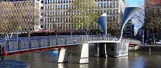 The bridge was designed by the Irish artist Eilis O'Connell, in conjunction with Ove Arup & Partners engineers.[4] It was formally opened in 1999 by Paul Boateng MP, then a Home Office minister.[5] The name of the bridge was attacked by then Liberal Democrat councillor Stephen Williams. He condemned the decision as "gesture politics", instead wanting a statue or permanent memorial to remember Bristol's role in the slave trade.[6] Eilis O'Connell commented "The council can call it what they want, but Pero's Bridge sounds a bit political."[7] Hundreds of people now attach padlocks to the bridge as a sign of affection to each other.
