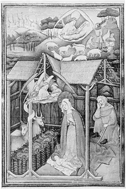 In August 1432 Lamy was again working with Bapteur, this time on the sale nove (new room) and new chapel of the château at Thonon—the project which had taken Bapteur away from the Apocalypse. This is Lamy's only preserved or recorded non-manuscript work. For the rest of his life he was a miniaturist, but none of the manuscripts he worked on has been identified.[6] In 1434, before he had even ceased work on the Apocalypse, Lamy illuminated a book of hours for Anne of Lusignan, giving it one hundred gold letters. In 1436 Lamy completed a Nativity scene for the frontispiece of a Gospel book commissioned by Pietro Donato; the rest of the illuminations in this work were done by Johannes de Monterchio.[7] The identification of this work as Lamy's was first communicated to the Pierpont Morgan Library by Otto Pächt in 1943. While the bulk of the Gospel lectionary is in the Paduan style, the frontispiece is distinctly un-Italian; it was once attributed to an Upper Rhenish artist.[8] Probably Lamy was hired by Donato while the latter was attending the Council of Basel.[9] Donato hired Lamy again to work on the miniatures for his copy of the Codex Spirensis, an important Carolingian compilation containing notably the Notitia Dignitatum and De rebus bellicis. The initials in this manuscript are by others. The miniatures are immensely useful to scholars as basically faithful reproductions of the originals, shedding much light on the late Roman army.[10] The architectural illustrations in the Notitia appear influenced by the manuscript workshop of the French regent, John, Duke of Bedford. At least one of the illustrations, a view of Constantinople, appears to have been an addition of Peronet not found in the original.[11] Peronet produced another copy of the Notitia (which was in Florence c.1443) wherein the miniatures are stylised and "modernised".[12]