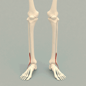 The muscle passes downward and ends in a tendon that passes under the superior extensor retinaculum and the inferior extensor retinaculum of the foot in the same canal as the extensor digitorum longus muscle.[1] It may be mistaken as a fifth tendon of the extensor digitorum longus.[1] The tendon inserts into the medial part of the posterior surface of the shaft of the fifth metatarsal bone.[1]