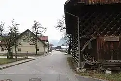 Zgornje Perovo Manor (dvorec Zgornje Perovo)—also known as Šmolc Manor (Šmolčeva graščina), Oberperau Manor, or Tomšič Manor (Tomšičeva graščina)—stands across the river from Spodnje Perovo Manor in the hamlet of Zgornje Perovo. It is a two-story building dating from the 15th century. The windows on the ground floor preserve Gothic elements, and those on the upper floor have Baroque elements.[8]