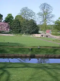 In the 1980s, work was completed to lower the parkland south-west of the river, and to create flood alleviation measures. At times of flood, excess water from the river flows over a bund and onto the sports pitches, where it is held until it can be safely and slowly released. By Summer (northern hemisphere) 2014, this had occurred on four occasions. The area is designated as a reservoir, Perry Hall Playing Fields Flood Detention Reservoir,[a] which has a capacity of 184,000 cubic metres (40,000,000 imp gal).[3][4]