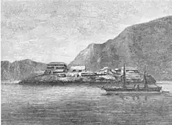 After it was evacuated, Telegraph Island remained an important strategic point, as evidenced by the decision of the British Government in 1904 to erect flagpoles there. However, an agreement could not be reached about which flag to fly – the Union Jack or the Blue Ensign of the Royal India Marine. The former would imply sovereignty over the island, which Britain did not have, while the latter might bring responsibility on the British to defend it, which the government did not want. It was eventually decided to fly neither flag, and all the flagpoles were removed except one. The flagpole could not be seen from the open sea but is not clear whether officials in London ever appreciated this fact.[7]