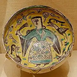 Innovations in Seljuk pottery include the production of mina'i ware (meaning "enamelled ware"), developed in Kashan in the decades leading up to the Mongol invasion of Persia in 1219, after which production ceased.[11] It has been described as "probably the most luxurious of all types of ceramic ware produced in the eastern Islamic lands during the medieval period".[12] The ceramic body of white-ish fritware or stonepaste is fully decorated with detailed paintings using several colours, usually including figures.[12]