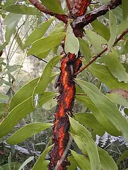 The term geebung is derived from the Dharug language word geebung, while the Wiradjuri term was jibbong.[11] The etymology of "snottygobble" is more obscure. The English Dialect Dictionary published in 1904 lists snotergob, snot-gob and snotty-gobble as "the fruit of the yew-tree, Taxus baccata" noting that "children devour quantities of the red part of these berries, which they call snotty-gobbles, and suffer no ill-effects".[12] The pulp around the hard stone in the drupes of Persoonia is edible although "the operation is a little like nibbling sweet cotton wool".[13]