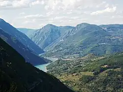 Lake Perućac (Serbian: Језеро Перућац, romanized: Jezero Perućac) is an artificial lake on the Drina River, on the border between Bosnia and Herzegovina and Serbia. It was created in 1966 and occupies a natural bend of the river, which encircles the Tara mountain, between towns of Višegrad in Bosnia and Bajina Bašta in Serbia.