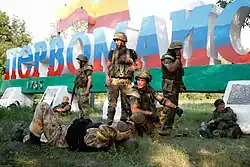 After several months of little military progress, in July 2014 the Ukrainian forces made sweeping territorial gains, capturing swathes of territory from pro-Russia rebels across Donbas.[29] On 25 July 2014 the Kyiv Post reported that the Ukrainian army push for the city was imminent, and that the separatists had been "chased" by the Ukrainian army from nearby settlements and intended to make Pervomaisk their "last stand".[30] Intense fighting for control of Pervomaisk between the pro-Russia separatists and the Ukrainian army broke out on 28 July 2014, and would wage on throughout August, with both sides claiming control of the city.[31][32] It would later be established that, despite heavy bombardment, the separatists had held Pervomaisk for the whole time.[33][34][35] By September 2014, separatist control of Pervomaisk was undisputed.[36][37]