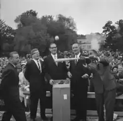 US Vice President Lyndon B. Johnson's visit in 1963. US Ambassador to Finland Carl Rowan (right) hits the ball with a baseball bat and a founder of Pesäpallo Lauri Pihkala (left) in Kaivopuisto, Helsinki