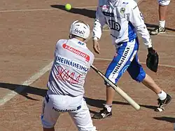 The basic idea of pesäpallo is similar to that of baseball: the offense tries to score by hitting the ball successfully and running through the bases, while the defense tries to put the batter and runners out. One of the most important differences between pesäpallo and baseball is that the ball is pitched vertically, which makes hitting the ball, as well as controlling the power and direction of the hit, much easier. This gives the offensive game more variety, speed, and tactical aspects compared to baseball.[3] The fielding team is forced to counter the batter's choices with defensive schemes and anticipation.