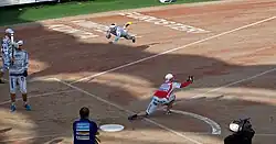• When entering a base, the runner only has to cross the line of the base; there are no actual cushion bases like in baseball, only lines on the field showing each base's boundaries (A much larger area compared to the bases used in baseball). Similarly, the pitcher or the fielders in the bases do not have any plates to touch to make an out; having only a foot in the base is enough.