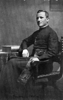 In the autumn of 1917, Čule enrolled at the Catholic Faculty of Theology in Sarajevo. The Jesuits, who greatly impacted Čule, led the faculty, serving as professors and their heads.[16] He was an excellent student.[3] After finishing the third year, Čule was ordained a priest on 20 June 1920 by the then diocesan administrator of Vrhbosna Ivan Šarić who later became the archbishop.[3][17] Čule held his first mass on his name day, 29 June 1920.[18][19] Since Kruševo still wasn't a parish nor did it have a church, Čule held his first mass at the local Sajmište cemetery, where his mother, who died in 1919, was buried.[3][18][19] Dominik Mandić held the sermon.[19]