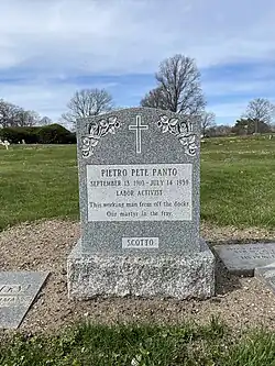 Pietro "Pete" Panto (September 13, 1910 โ July 14, 1939) was an Italian American longshoreman and union activist[1] who was murdered by the mob for attempting to revolt against union leadership.[2] Panto was born in Brooklyn and at an unknown date he left the United States, returning on June 3, 1924, on the SS President Wilson that sailed out of Naples. He left the United States again, returning on March 22, 1934, on the SS Sinaia that sailed out of Palermo. Both ship registries list 198 Sackett Street in Brooklyn as his address.