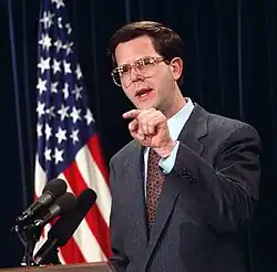Pete Williams as Assistant Secretary of Defense for Public Affairs at a press briefing, 1991