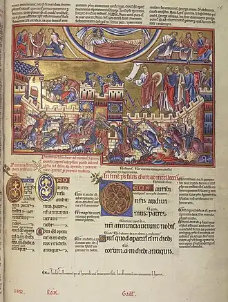 Psalm 44, from the illuminated manuscript BnF lat. 8846, the Anglo-Catalan Psalter. The miniatures in this manuscript were painted by Ferrer Bassa under the patronage of Peter of Ribagorza between 1346 and 1348.[1]