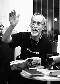 Peter-Paul Zahl's literary works include poems, essays, novels and plays, as well as social reportages, appeals, articles and pamphlets. He is best known for his state-critical poems and his novel Die Glücklichen. Ein Schelmenroman, was written in prison and published in 1979. He wrote for the Rotbuch Publishing House in Berlin. On the occasion of his 65th birthday in 2009, and even more so in numerous obituaries in 2011, the German media paid tribute to his entire oeuvre. His work was described as deeply political but undogmatic, and he was considered the bad boy of the literary scene, according to editor Gabriele Dietze, because he did not fit into any cliché.[40] His irony and, in particular, his self-irony, as well as his "very humorous relationship to his own text" are emphasized.[40] In his prose, Peter-Paul Zahl "liked to explore the abysses of good society and [set] monuments to the little lawbreakers," according to the philologist Wolfgang Harms.[41] He was not considered a political theorist or a great thinker, but a clever and talented writer and a good storyteller. Many of his publications are "shrill, aggressive, almost unbearably poster-like [...] with pointed lances," as the columnist Fritz J. Raddatz wrote in 1977, but they speak of a "disappointment disguised as laconicism, a shrug of the shoulders.[26]