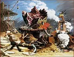 Blume's works often portrayed destruction and restoration simultaneously.[1] Stones and girders made frequent appearances; The Rock (1944–1948), today in the collection of the Art Institute of Chicago, was interpreted by its viewers as symbolizing renewal in the wake of World War II. Recollection of the Flood (1969) depicted the victims of the 1966 Flood of the River Arno in Florence along with restorers at work. The Metamorphoses (1979) invoked the Greek legend of Deucalion and Pyrrha, who repopulated the earth after a deluge.[1]