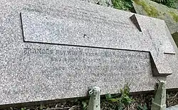 In May 1818, Heywood declined command of the Canadian Lakes with the rank of commodore. As he had become content with shore life, he said he would only accept another appointment in the event of war.[113] In retirement Heywood published his dictionary of the Tahitian language, wrote papers relating to his profession, and corresponded widely.[85][114] He enjoyed a circle of acquaintances which included the writer Charles Lamb, and was a particular friend of the hydrographer Francis Beaufort.[115] He destroyed much of his writing shortly before his death, but a document from 1829 survives, in which he expresses his views on the unfitness for self-government of Greeks, Turks, Spaniards and Portuguese, the iniquities of the Greek Orthodox and Roman Catholic churches, and the doubtful benefits of Catholic emancipation in Ireland.[116] Of strong religious convictions, Heywood was increasingly interested in spiritual matters during the last years of his life. His health began to fail in 1828, and he died after suffering a stroke, aged 58, in February 1831.[117] He was interred in the vault of Highgate School chapel,[118] where a memorial plaque was dedicated on 8 December 2008,[119] and is also memorialised on the grave of his widow Frances on the west side of Highgate Cemetery.