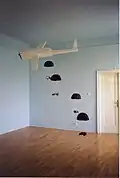 After the Postoj, Kalmus participated at many art exhibitions in Slovakia and abroad.[5] Kalmous considers creating art to be his lifestyle.[6] His work reflects the public obsession with consumerism as well politics, death, religion, sports.[7] He has several long-running projects, including the cycles Partitúry (Scores) and Korózne grafiky (Corrosive Prints). Perhaps his well-known long-term project has consisted of wrapping a wire around at least one stone every day between 1998 and 2022, representing the 70 000 Jews deported from Slovakia by the fascist Slovak Republic during the World War II.[3] A Peter Kalous' Holocaust monument, consisting of four glass tubes filled with the wire-wrapped stones, was first uncovered in 2016 by the President of Slovakia Andrej Kiska. It is located in a renovated synagogue in the town of Lučenec.[8]