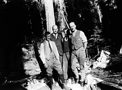 At Old Cabin camp, Dutch Creek southern Purcells, Canada, (July 24, 1930). From left to right: Peter Kaufmann-Bohren (1886-1971), James Monroe Thorington (1894-1989), Conrad Kain (1883-1934) and Olivier Eaton Cromwell (1892–1987) during the expedition to find the source of the Columbia River.