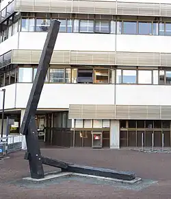In 1989, Nicholls spent three months in Europe and found new inspiration in recent sculptural works like Andy Goldsworthy's Sidewinder (1985) in Grizedale Forest and Kier Smith's Iron Road (1986) in the Forest of Dean Sculpture Trail.[5] An important work produced in the wake of these experiences was Whanganui (1990), today in the collection of the Sarjeant Gallery. This complex work was inspired by a journey undertaken by Nicholls's ancestor Richard Taylor along the Whanganui River. Made of two native woods, rimu and totara, and two woods introduced to the area by Taylor, willow and poplar, the winding, nine-metre work imitates the movement of the river, but various objects embedded into the wood (a river paddle, a brass compass, a Māori adze-head) suggest the impact of both native and settler culture.[10] In the late 1990s and early 2000s, Nicholls created some of his largest and most recognised sculptures. Rakaia (1996–97) is Nicholls's contribution to the international sculpture collection at Gibbs Farm, north of Auckland;Tomo (2005) is at the Connells Bay Sculpture Park on Waiheke Island; and Junction (2009) stands near the railway line at New Lynn, Auckland. Junction features prominently in the 2015 music video for Anthonie Tonnon's song Railway Lines.[11] In 2013, Nicholls gifted another large work, Moorings, to the city of Whanganui, his birthplace. The work, which references the Whanganui River's nine tributaries, is sited beside the river at Moutua Quay.[12]