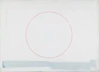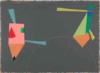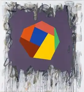 Plagens's early work featured single, emphatic shapes—circles with wedges removed, diamonds, trapezoids, and thin letter "C"-like rings—which he placed on vivid red-orange or creamy white color fields that sometimes disintegrated at the canvas edges into irregular, soft bands of subtle color.[34][15][6] Increasingly minimal works, such as Cleveland Defaults on Its Debts (1979) or Cubist Landscape (1980), have been recognized for carefully calibrated compositions that challenged conventional rules about balance and probed the line between elegance and awkwardness, and friction and harmony.[35][7][21][32] In pivotal paintings of the mid-1980s, such as Wheels of Wonder (1985) and Wedge of Life (1987),[6] Plagens incorporated angular, eccentric polygons, greater surface variation and a new sense of movement that reviewers such as Grace Glueck deemed "witty balancing acts."[36][32][37] During this time, he also created the drawing series "My Father Worked in Advertising" (1986), which featured dappled, abstract expressionist-like areas around the edges over which he painted and collaged fields of color and hard-edged and irregular shapes.[15]